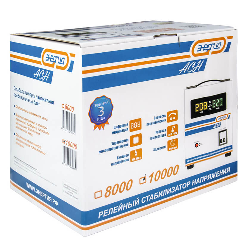 Отличительной чертой стабилизаторов напряжения серии Энергия АСН является их температурный диапазон работы (от -20°C до +40°С), это позволяет эксплуатировать их в неотапливаемых помещаениях, а так же включать во время осенних и весенних заморозков без предварительного прогрева. Стабилизатор имеет современное микропроцессорное управление силовым блоком и многоступенчатую систему защиты. В силовом блоке применяется технология плавного старта и программирумая задержка включения, что позволяет надежно защитить технику с двигателями (холодильники, насосы, инструмент и т.д.) от скачков во время отключения и подачи электроснабжения. А система поглощения электрической дуги и технология "Current zero cross control" (переключение в нулевой точке), обеспечивают отсутвие искажений в синусоиде переменного напряжения.