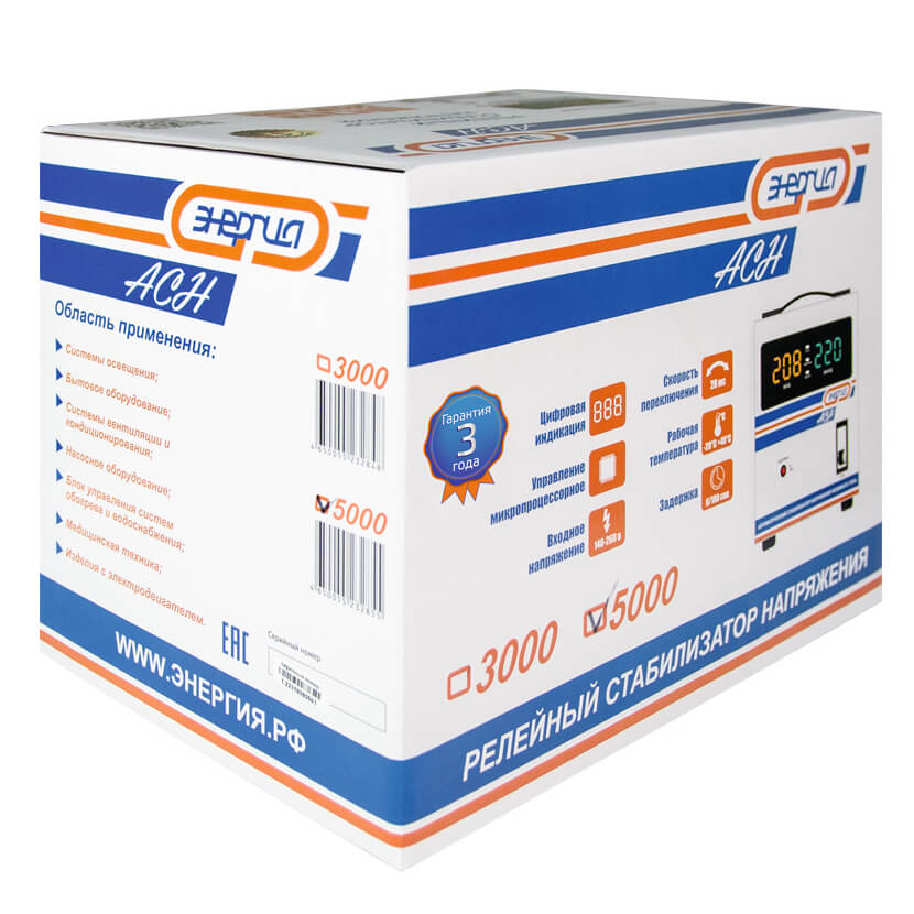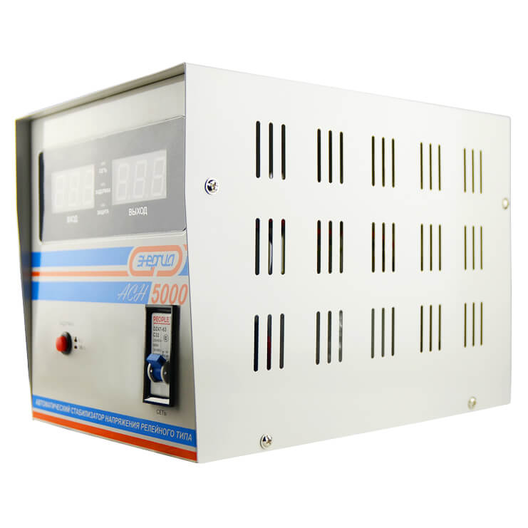 Однофазный стабилизатор напряжения Энергия ACH-5000 применяется для защиты от колебаний напряжения в электросети котлов, насосов и другого дорогостоящего электрооборудования. Он относится к стабилизаторам релейного типа и может эксплуатироваться при температурах от -20 до +40°С.