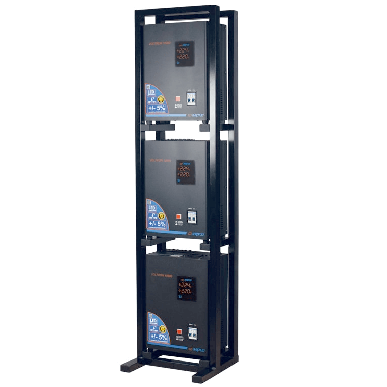 Коммутационная стойка Энергия 135-33-20 предназначена для размещения и подключения настенных стабилизаторов напряжения Энергия Voltron мощностью 8 и 10кВА к трехфазной сети. Стойка максимально адаптирована к данным стабилизаторам по размерам и дизайну. Использование стойки упрощает электромонтаж комплекта стабилизаторов и позволяет минимизировать занимаемую площадь, за счет расположения стабилизаторов друг над другом. При этом остается открытый доступ ко всем элементам управления и коммутационным блокам стабилизаторов, а так же не нарушается режим вентиляции.