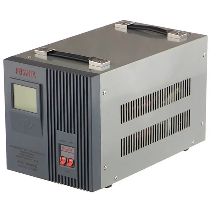Стабилизатор Ресанта АСН-10000/1-Ц предназначен для выравнивания входного напряжения и защиты приборов от перепадов напряжения с суммарной мощностью до 10 кВт. Стабилизатор оснащен фильтрами сетевых помех, предотвращающими искажение частотной синусоиды, микропроцессорным управлением и цифровым индикатором напряжения, на котором отображаются текущие параметры напряжения. Прочный корпус защищает внутренние узлы аппарата от повреждений.