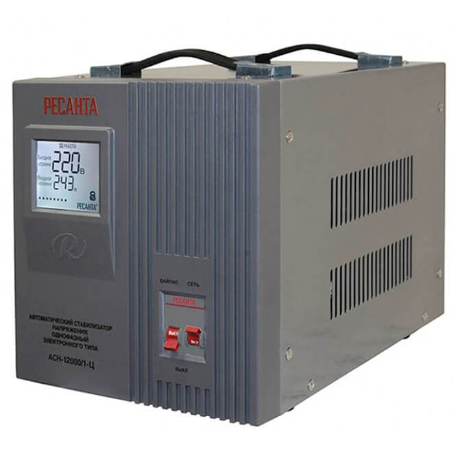 Стабилизатор Ресанта АСН-12000/1-Ц предназначен для выравнивания входного напряжения и защиты приборов от перепадов напряжения с суммарной мощностью до 12 кВт. Стабилизатор оснащен фильтрами сетевых помех, предотвращающими искажение частотной синусоиды, микропроцессорным управлением и цифровым индикатором напряжения, на котором отображаются текущие параметры напряжения. Прочный корпус защищает внутренние узлы аппарата от повреждений.