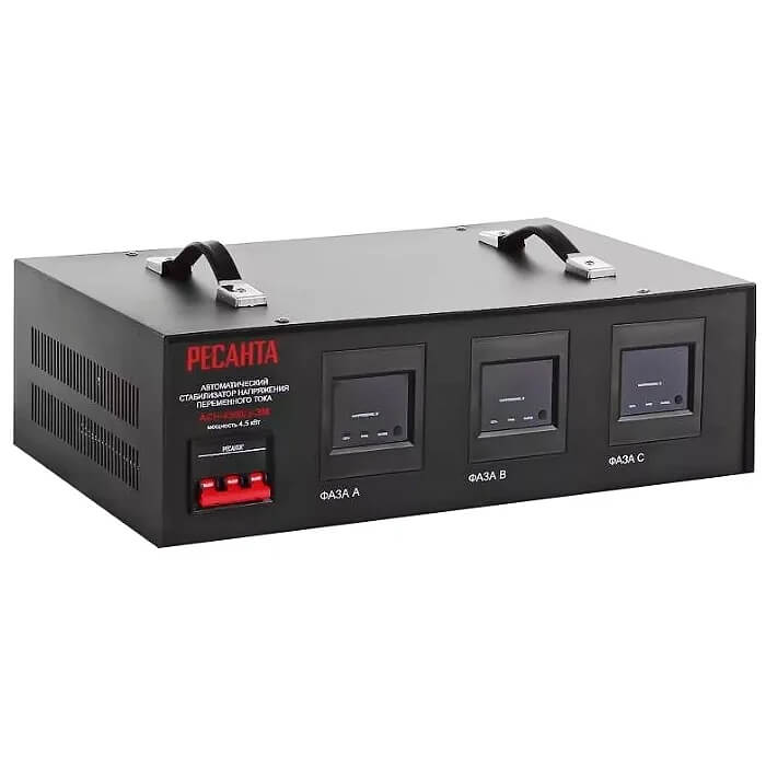 Стабилизатор напряжения Ресанта АСН-4500/3-ЭМ предназначен для работы в бытовых и промышленных трехфазных электросетях. Стабилизатор автоматически поддерживает постоянный уровень напряжения, защищая от скачков, просадок, перекоса фаз, и позволяет избавиться от проблем, вызванных некачественным электроснабжением.
