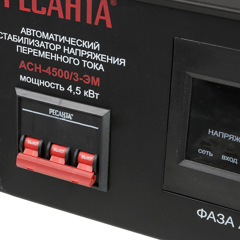 В конструкции стабилизатора Ресанта АСН-4500/3-ЭМ применены современные инновационные подходы, позволившие добиться удачного сочетания высокой надежности прибора, точности удержания выходного напряжения и его невысокой стоимости. В отличии от своих аналогов, стабилизатор оснащен многоступенчатой системой защиты, включающей в себя блоки защиты от коротких замыканий, перегрузки, обрыва фазы, пониженного и повышенного напряжения, фильтрами сетевых помех, а так же термозащитой, обеспечивающей абсолютную пожарозащищенность электросети.