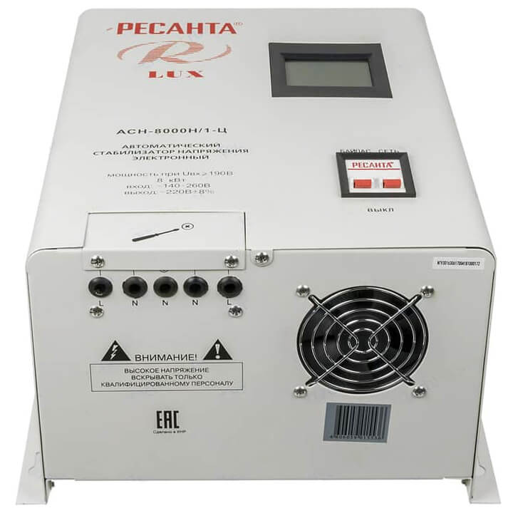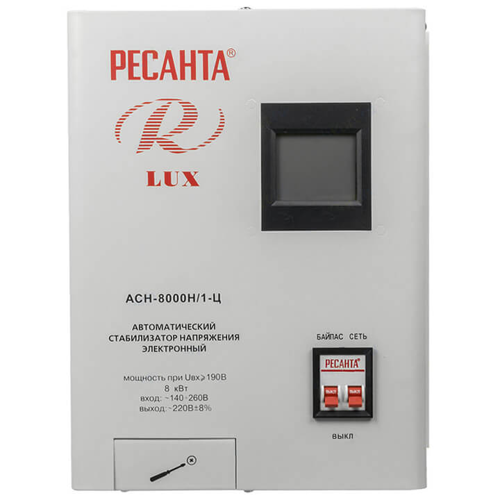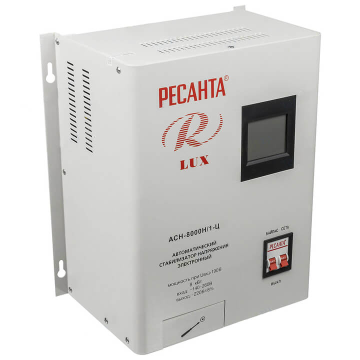 Настенный стабилизатор Ресанта LUX АСН-8000Н/1-Ц предназначен для выравнивания входного напряжения и защиты приборов от перепадов напряжения с суммарной мощностью до 8 кВт. Стабилизатор оснащен фильтрами сетевых помех, предотвращающими искажение частотной синусоиды, микропроцессорным управлением и цифровым индикатором напряжения, на котором отображаются текущие параметры напряжения. Прочный корпус защищает внутренние узлы аппарата от повреждений.