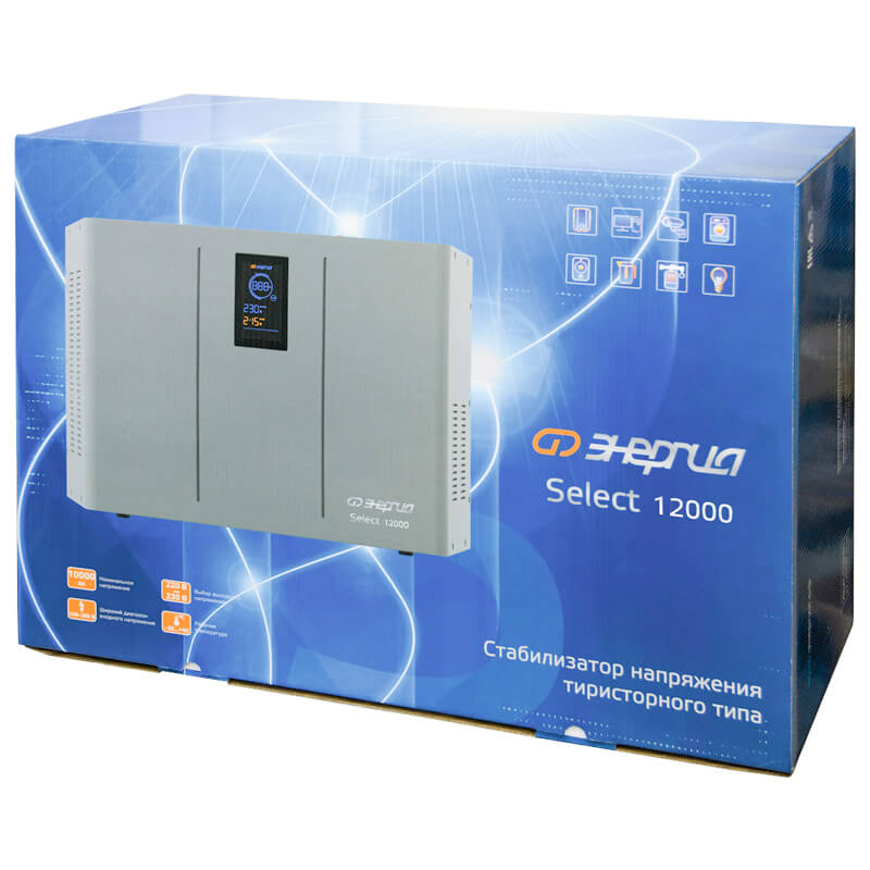 Стабилизатор Энергия Select-10000 оснащен комплексом систем, обеспечивающим надежную защиту как потребителей, так и самого стабилизатора от любых нештатных ситуаций, и рассчитан на непрерывную круглосуточную работу в условиях больших по значению и длительности отклонений напряжения от номинального значения.