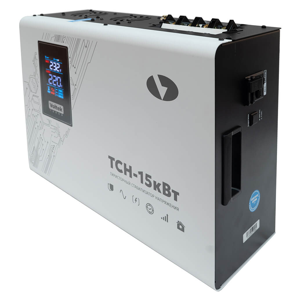 Стабилизатор Voltek ТСН-15кВт оснащен комплексом систем, обеспечивающим надежную защиту как потребителей, так и самого стабилизатора от любых нештатных ситуаций, и рассчитан на непрерывную круглосуточную работу в условиях больших по значению и длительности отклонений напряжения от номинального значения.