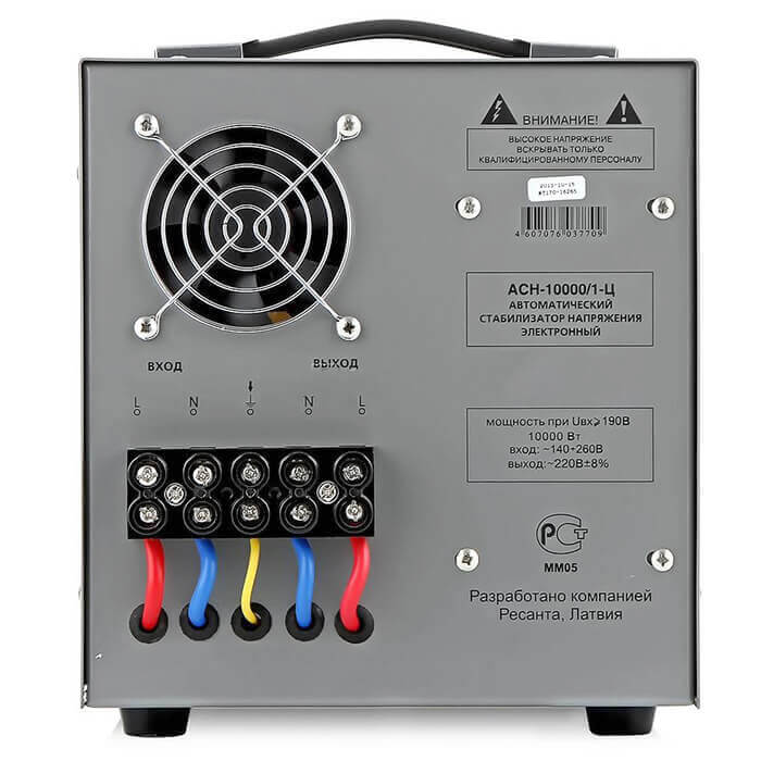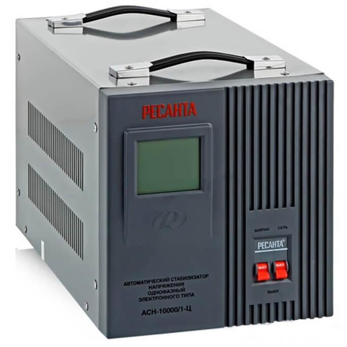 Стабилизатор Ресанта АСН-10000/1-Ц предназначен для выравнивания входного напряжения и защиты приборов от перепадов напряжения с суммарной мощностью до 10 кВт. Стабилизатор оснащен фильтрами сетевых помех, предотвращающими искажение частотной синусоиды, микропроцессорным управлением и цифровым индикатором напряжения, на котором отображаются текущие параметры напряжения. Прочный корпус защищает внутренние узлы аппарата от повреждений.