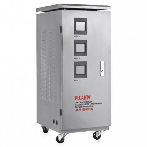Недорогой трехфазный стабилизатор напряжения Ресанта АСН-15000/3-Ц применяется для нейтрализации скачков и просадок напряжения в бытовых и промышленных трехфазных электросетях 380В. Основная область применения этого стабилизатора - загородное жильё, офисные и промышленные объекты с трехфазным подключением.