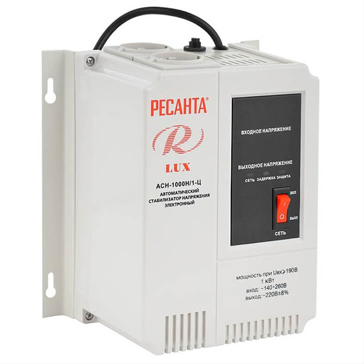 Настенный стабилизатор Ресанта LUX АСН-1000Н/1-Ц предназначен для выравнивания входного напряжения и защиты приборов от перепадов напряжения с суммарной мощностью до 1 кВт. Стабилизатор оснащен фильтрами сетевых помех, предотвращающими искажение частотной синусоиды, микропроцессорным управлением и цифровым индикатором напряжения, на котором отображаются текущие параметры напряжения. Прочный корпус защищает внутренние узлы аппарата от повреждений.