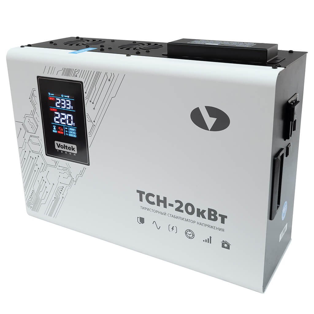 Стабилизатор Voltek ТСН-20кВт оснащен комплексом систем, обеспечивающим надежную защиту как потребителей, так и самого стабилизатора от любых нештатных ситуаций, и рассчитан на непрерывную круглосуточную работу в условиях больших по значению и длительности отклонений напряжения от номинального значения.
